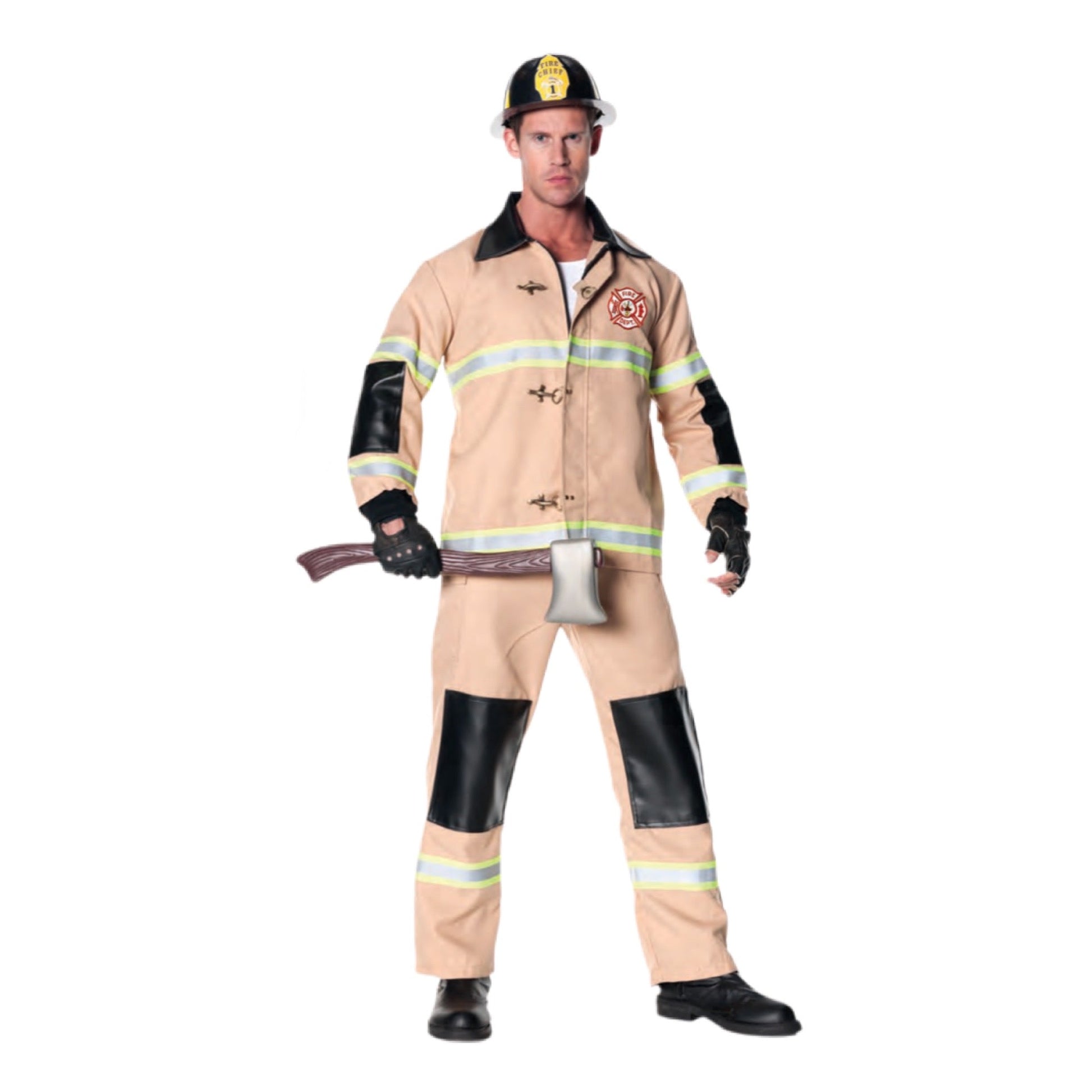 Jacket with embroidered patches, bibbed pants with attached suspenders, helmet
