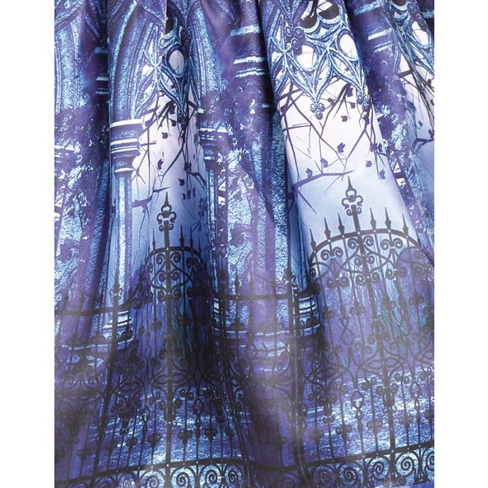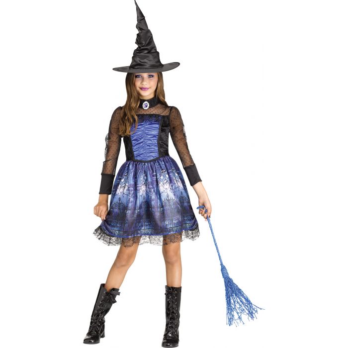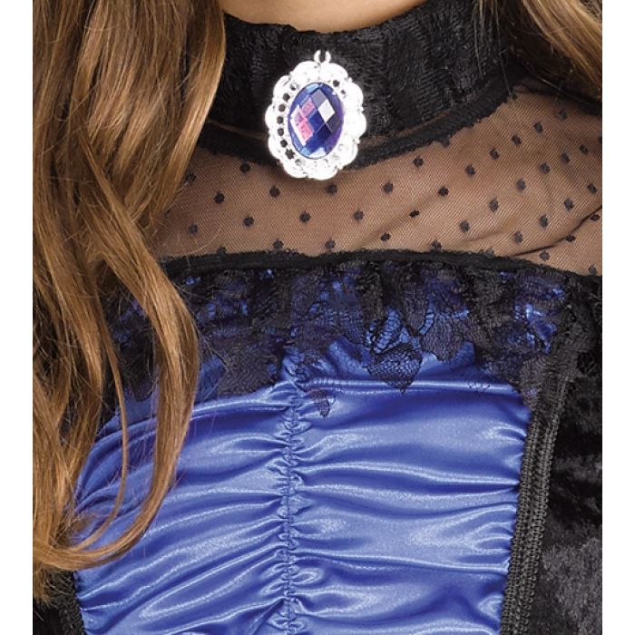 Black mesh and velevt bodice dress with ruched inset attached to a vibrant blue photoreal print skirt. Lace accents add a goth flair! Inclides a black witch hat and choker with faux sapphire gemstone. Let the haunting begin!