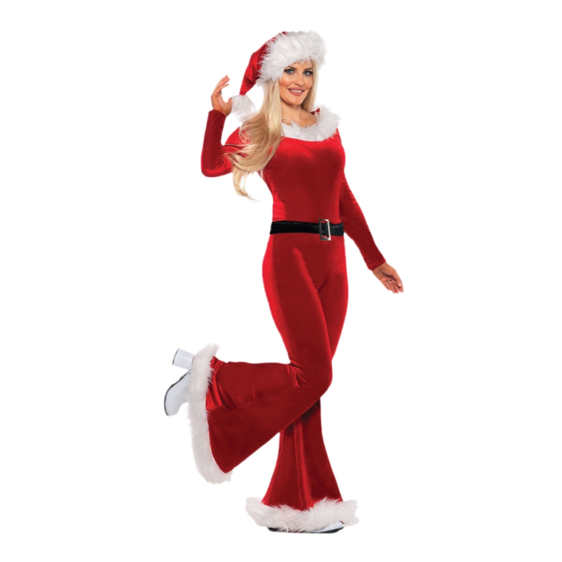 Fur-trimmed crop top, bell bottom fur-trimmed pants with attached belt