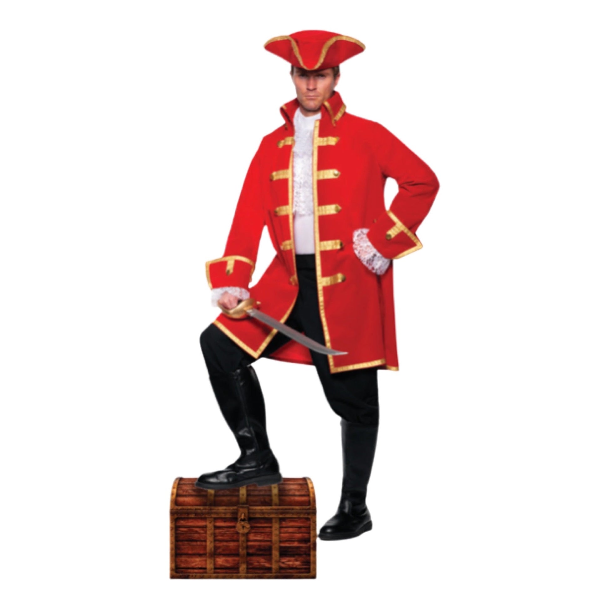 Velvet trimmed coat with attached collar and lace cuffs, pants and tri-corner hat