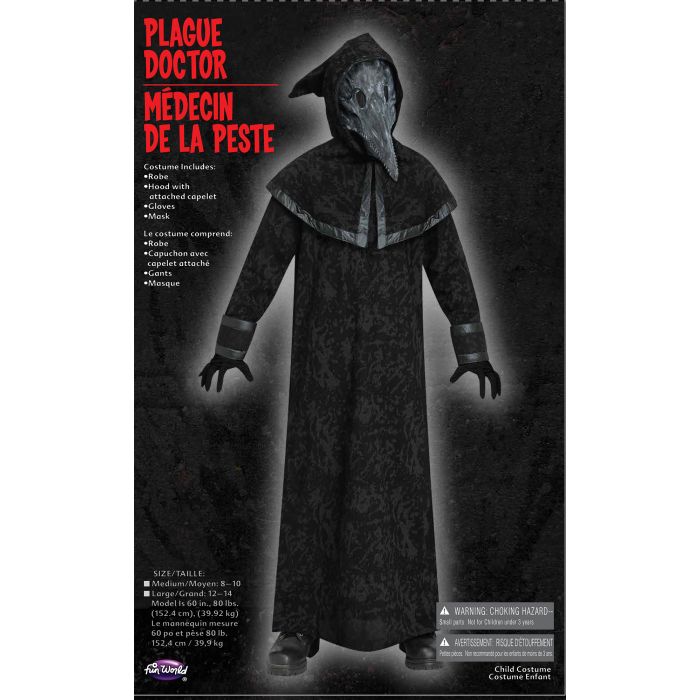 A frightening figure to fight the Plague! Complete costume features full-length distressed look robe with long sleeves and cuff finish, matching hood with capelet and faux leather trim, black poly gloves, and fearsome plague doctor half mask with back of head elastic. What's Included Robe, Hood, Gloves, Latex Mask Available Child Sizes M 8/10