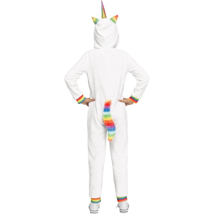 Features soft white, hooded jumpsuit with zipper front opening, rainbow stripe tummy, ankle and wrist cuffs, attached ears and detachable tail. Also includes shimmering iridescent attached unicorn horn.