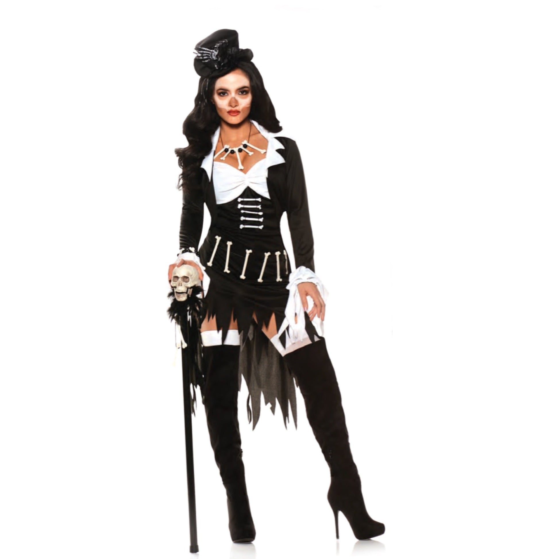 Ragged hem minidress with attached cropped tuxedo jacket with tails, bone belt and mini top hat